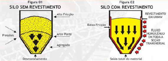 O revestimento UHMW por ter uma alta resistência ao desgaste e antiaderencia, tem por finalidade evitar o deposito e aglomeração de materiais dentro dos silos, permitindo assim que materiais úmidos com argila e o agregamento do carvão, minérios, sais fertilizantes entre outros tenham um escoamento rápido e contínuo, proporcionando altos índices de produtividade. Com o revestimento de UHMW o contato direto do material transportado com o silo é de 0 % aumentando assim a vida útil do equipamento.